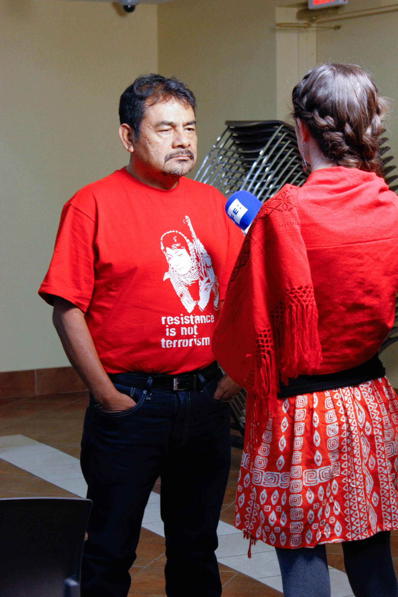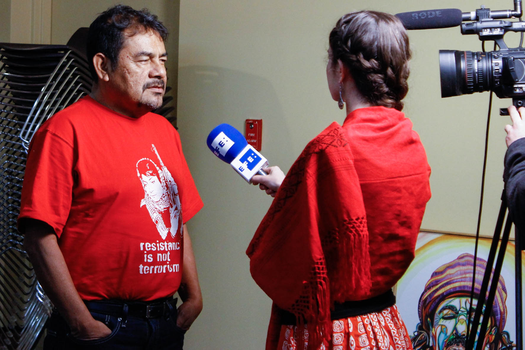 Felipe de la Cruz Sandoval being interviewed by EFE. Conchita Hernandez translating.