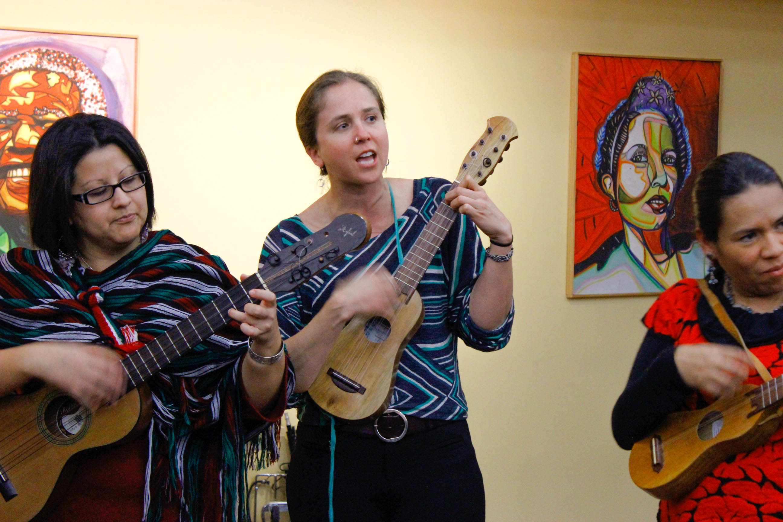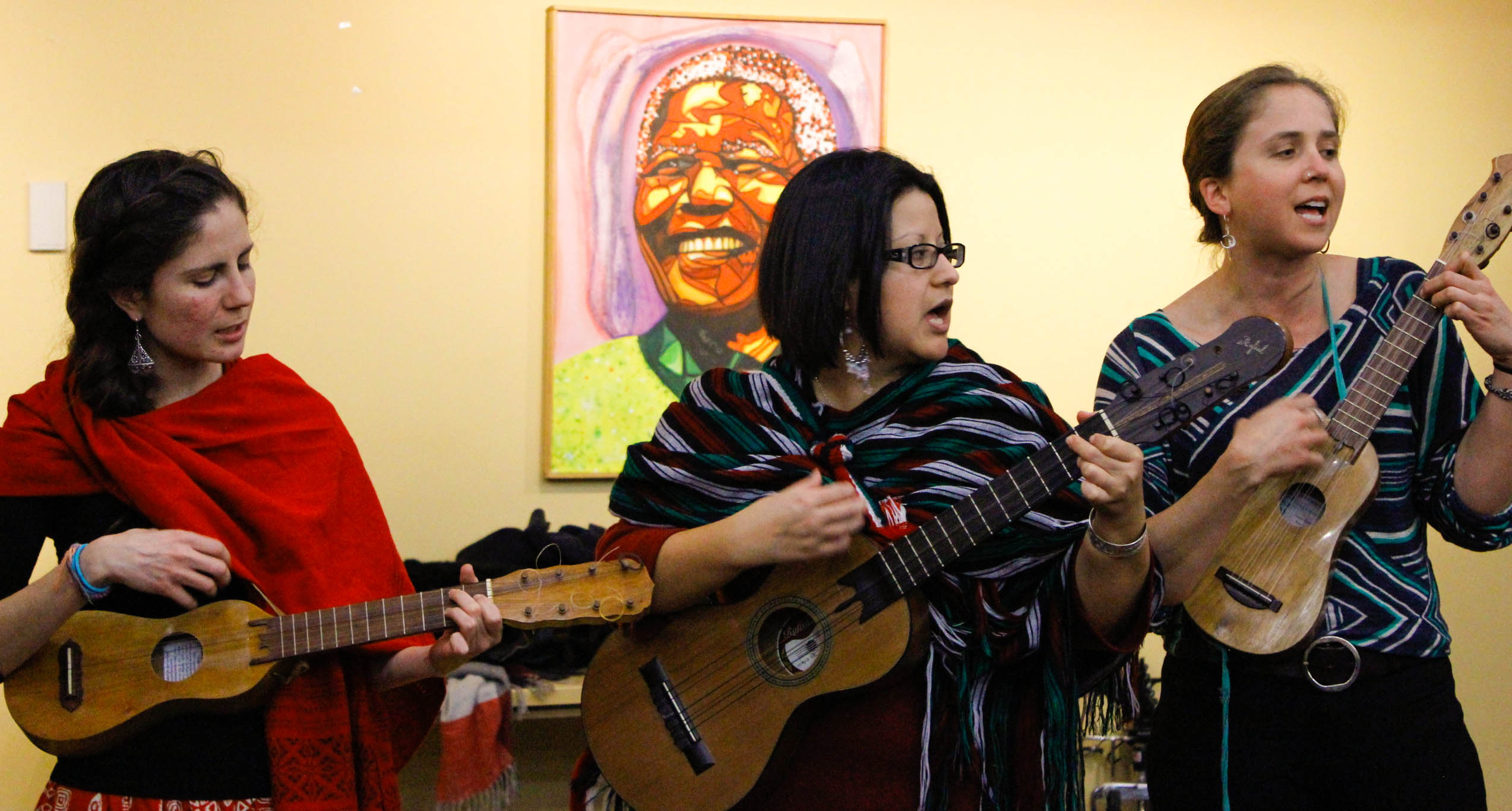 Son Cosita Seria members Salvador G. Sarmiento and Conchita Hernandez play music during protest chants.