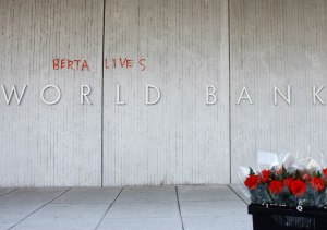 The first to gather for an April 5, 2016 vigil outside of the World Bank building were surprised to find that someone had scrawled “Berta Lives” by the front entrance with a blood red paint marker.