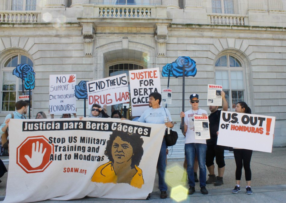 Photo coverage from a School of the Americas Watch-organized protest outside of the Cannon and Rayburn House office buildings in Washington, D.C. on April 18, 2016. Protestors demanded justice for the murder of Honduran indigenous and environmental rights activist Berta Cáceres shot to death in her home last month. Protestors also called on the U.S. government to cut off security assistance to Honduras and take responsibility for the United States’ role in legitimizing the 2009 coup in Honduras.