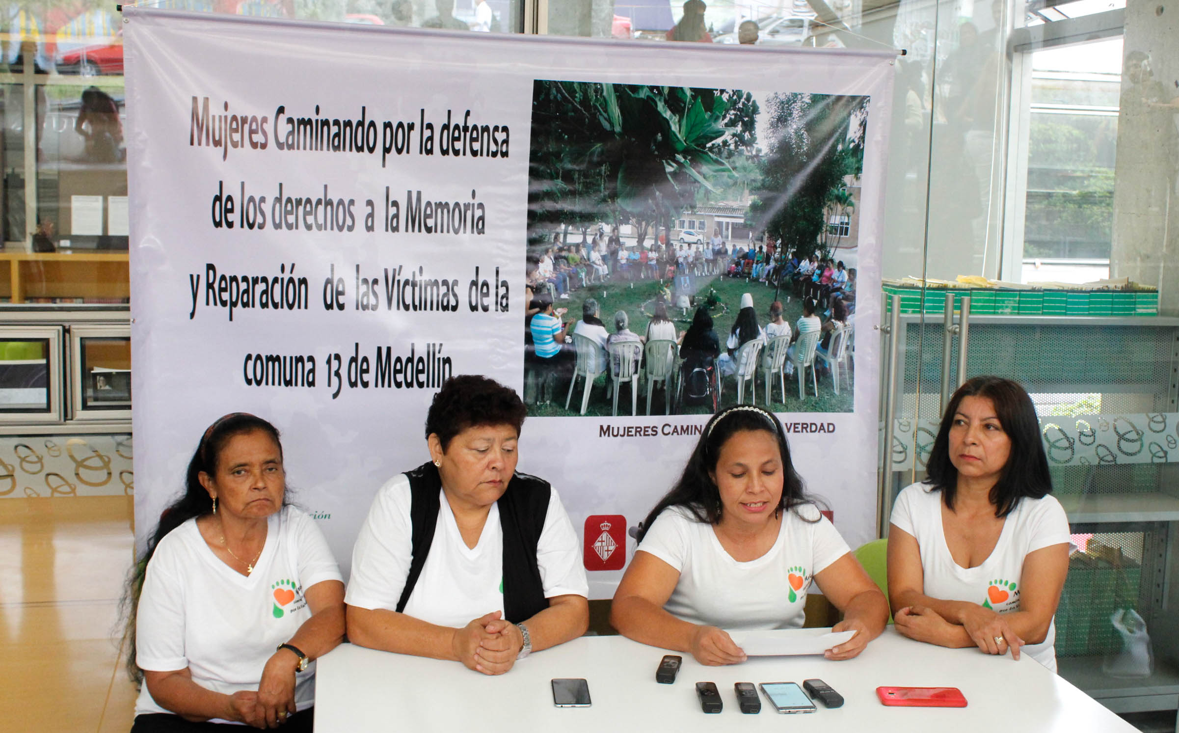 Members of the Comuna 13-based victims organization Women Walking for Truth present a statement at an October 14 press conference.