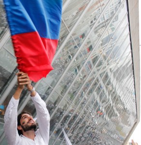 Pro-peace supporter waved a Colombian flag as thousands of marchers gathered in Medellín’s Park of Lights (seen reflected in the windows of the EPM Library).